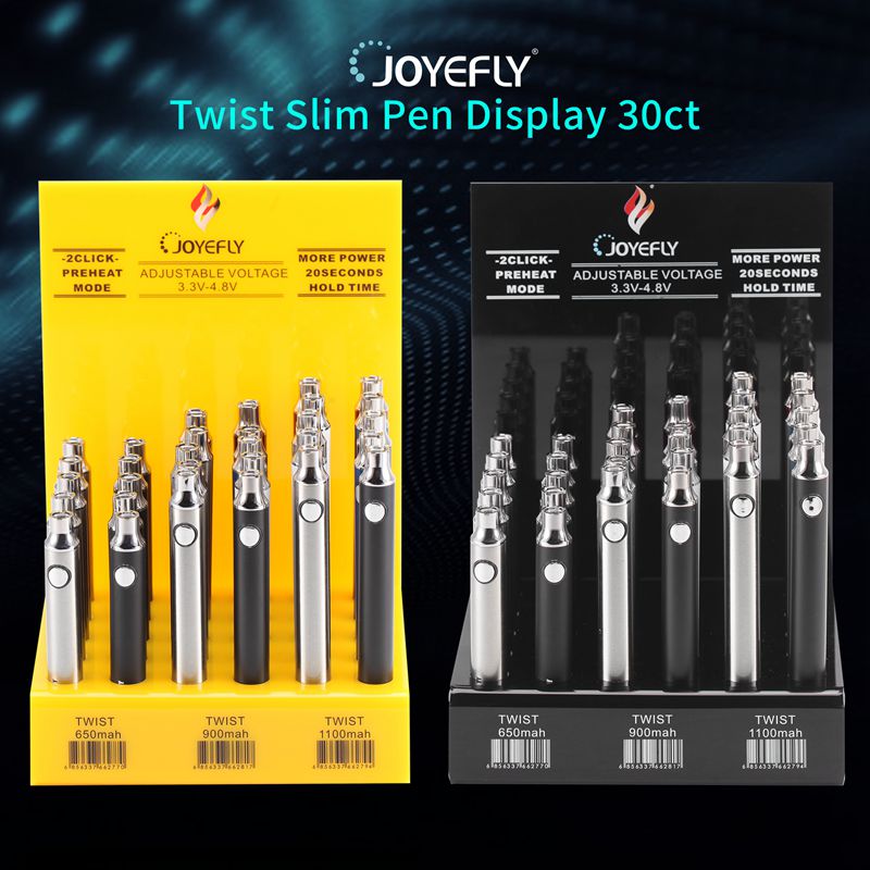 JOYEFLY Black TWISTY SLIM PEN DISPLAY 30ct brand : joyefly capacity : 350/650/900/1100mah display color : black /yellow /red /white /blue thread : 510 thread twisty voltage : 3.3v-4.8v pre heat mode wa:+8618138407901 , wechat:jenny3621