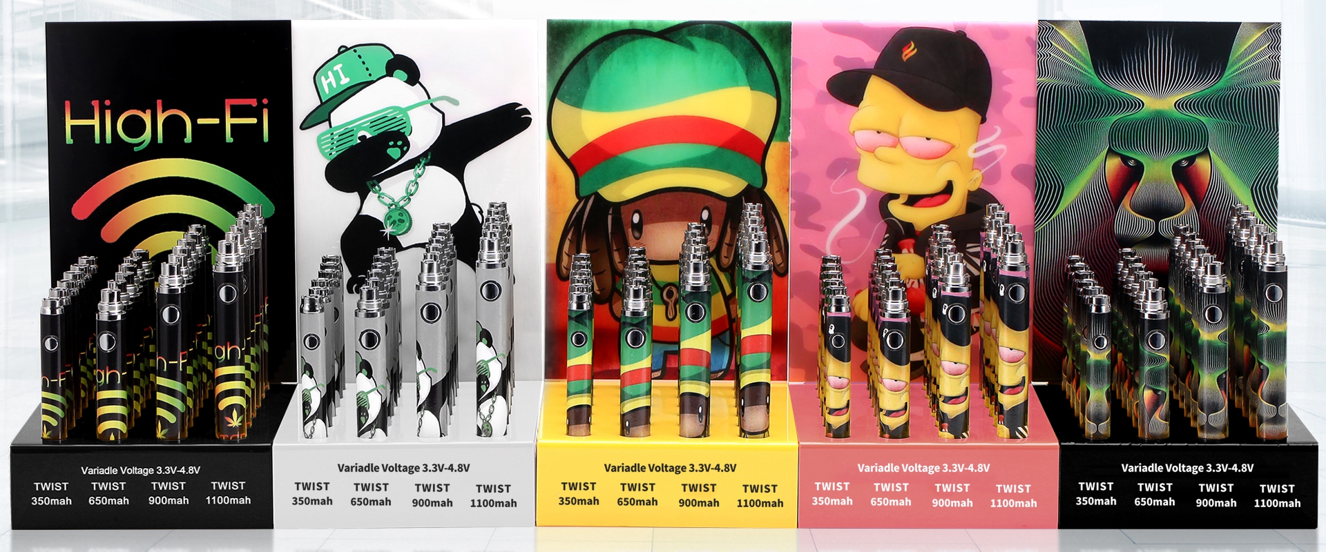 Rasta Twisty Slim Pen Dispaly 6ct each of350,650, 900,1100 mah Batteries AdjustableVoltage: 3.3V - 4.8V Preheat mode 5 Style like the image for choice